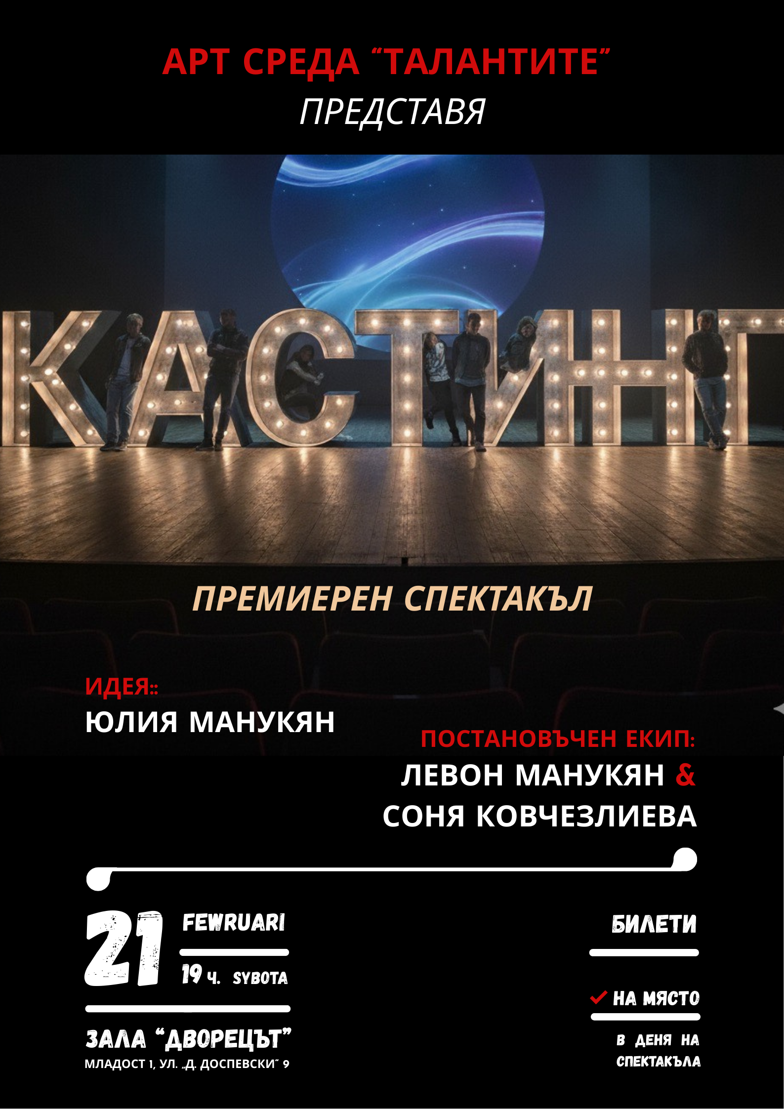 сценарий и режисура на творческия тандем Левон Манукян и Соня Ковчезлиева – създатели и ръководители на Арт среда „Талантите“.
